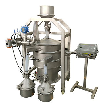 气体保护筛,是针对在筛分过程中有些物料不能与空气接触,否则就会发生氧化或爆炸。所以在筛分过程中,筛机、料仓、收料斗呈完全密封状态,同时需要充入惰性气体保护。筛分前对筛机、接料仓,管道内进行气体置换,氧含量低于设定值后,方可进行投料生产。启动旋振筛,同时打开超声波电源,打开放料阀,物料匀速投入超声波振动筛,进行精细筛分。在筛分过程中,氧含量检测仪实时监测设备内氧含量浓度,保证惰性气体保护物料。旋振筛利用振动电机作为激振源,通过振动电机上下两端的偏心重锤将旋转运动转变为水平、垂直、倾斜的三次元运动,并传递到旋振筛的筛面上;并且筛网可以叠加超声波高频振动,加快物料在筛网上的运动,可以解决粉体堵网,去除物料静电,根据不同物料筛分要求,在这个过程中,不同目数的物料通过各层对应目数的筛网后在各层的出料口排出,终实现筛选除杂或过滤分级的目的。调节上、下两端的相位角,可以改变物料在筛面上的运动轨迹。筛分结束后,关闭收料斗进料阀,关闭气体补气阀,筛分机停止,关闭超声电源。